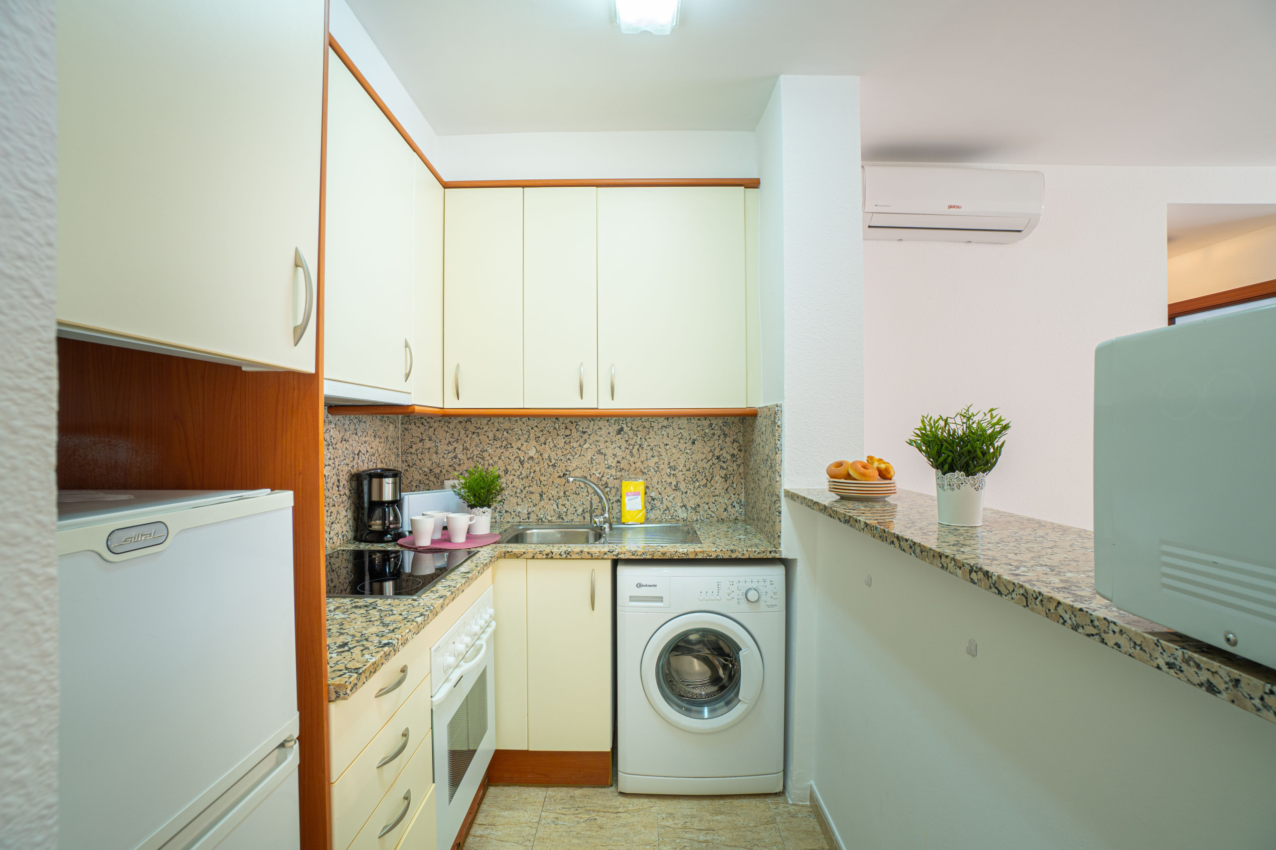 La cocina americana, de vitrocerámica, está equipada con nevera, microondas, horno, congelador, lavadora, lavavajillas, vajilla/cubertería, utensilios de cocina, cafetera y tostadora.