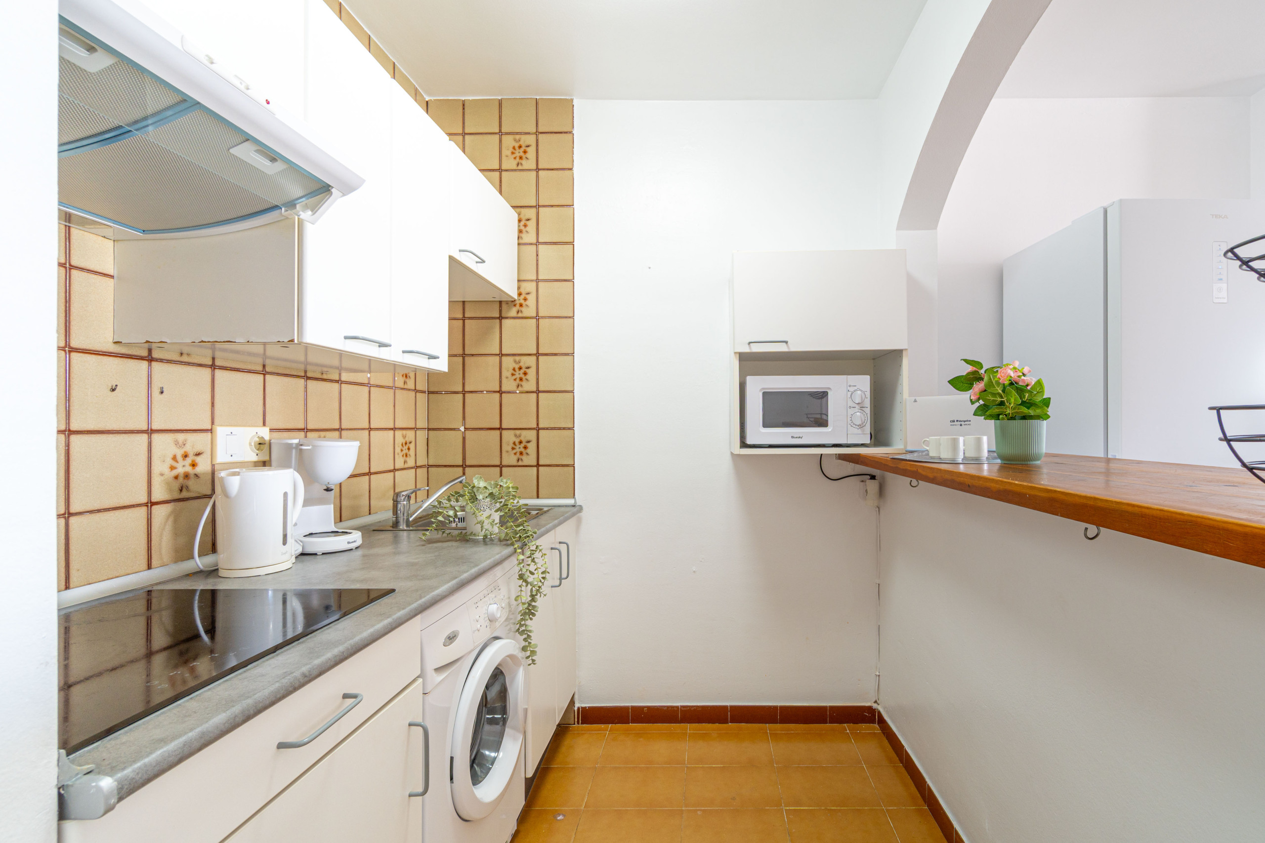 De open keuken, met keramisch fornuis, is uitgerust met koelkast, magnetron, servies/bestek, keukengerei en koffiezetapparaat.